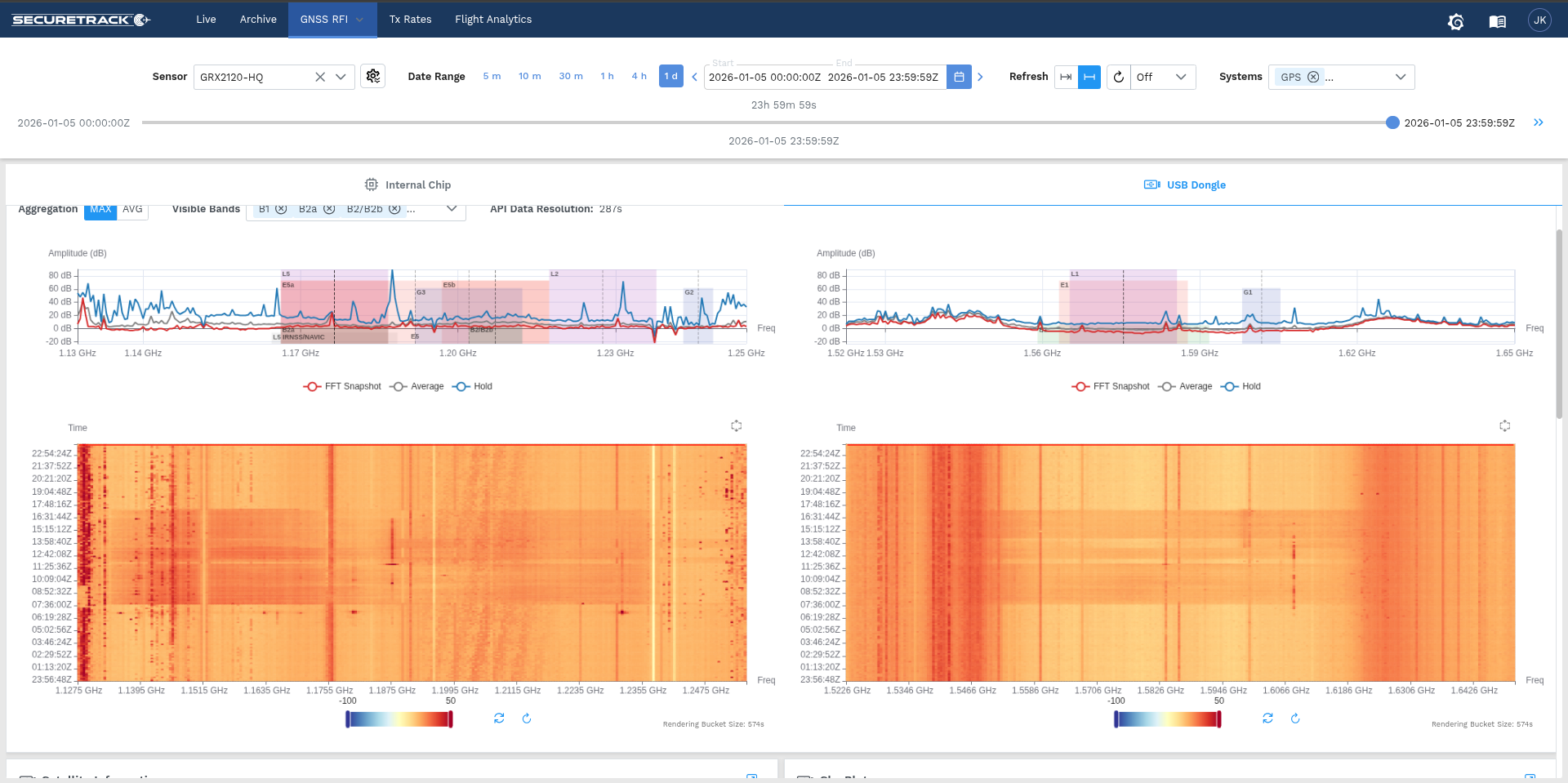 SecureTrack provides integrated airspace and ground RF spectrum monitoring that enables operators to observe spectrum activity across aviation surveillance and GNSS frequency bands while correlating airspace activity with receiver-level RF conditions on the ground.